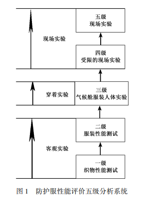 防化服的性能評價主要包含防護性能以及舒適性2個方面。 目前成熟的評價體系是五級分析系統(tǒng),如圖1所示。 可以劃分為客觀評價、人體穿著實驗以及現(xiàn)場實驗3個層次。