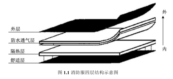 阻燃外層(最外側)、防水透氣層、隔熱層及舒適層(靠近皮膚-側)。阻燃外層直接接觸復雜的火場環(huán)境,需要有阻燃性能和一定的物理性能;外表層內部是防水透氣層,起到防水、防蒸汽以及防止有害物質滲透的作用;隔熱層的作用是了阻止熱量傳導至內部;舒適層為靠近皮膚一層,使穿著者體感更舒適。