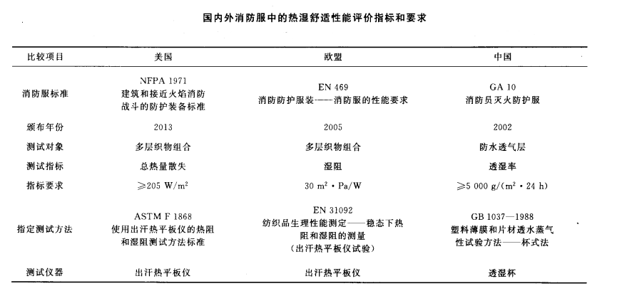 消防服相關(guān)標(biāo)準(zhǔn)對熱濕舒適性的要求