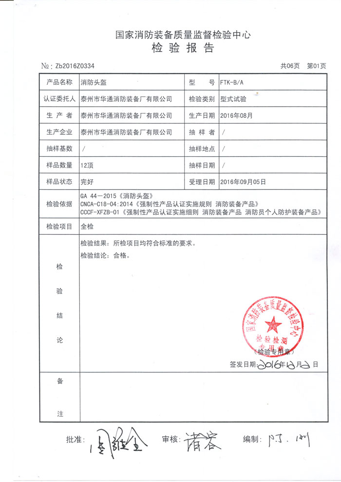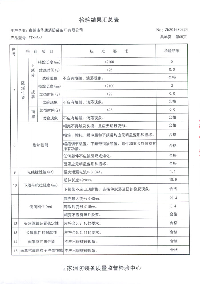 華通消防新型消防頭盔FTK-B/A符合GA44-2015標(biāo)準(zhǔn),CNCA-C18-04:2014《強制性產(chǎn)品認(rèn)證實施規(guī)則 消防裝備產(chǎn)品》,CCCF-XFZB-01《強制性產(chǎn)品認(rèn)證實施細則 消防裝備產(chǎn)品 消防員個人防護裝備產(chǎn)品》。沖擊吸收性能:最大沖擊力≤3780N,帽殼沒有碎片脫落,帽托亦沒有損壞和斷裂,帽箍于帽殼的連接機構(gòu)沒有損壞和斷裂??箾_擊加速度性能:帽頂部最大沖擊加速度≤150gn;帽前部最大沖擊加速度≤400gn;帽側(cè)部最大沖擊加速度≤400gn;帽后部最大沖擊加速度≤400gn。耐燃燒性能在火源離開帽殼后,帽殼火焰在5s內(nèi)自熄,沒有火焰燒透到帽殼內(nèi)部跡象,帽殼沒觸及頭模,且無明顯變形,帽箍、帽托、緩沖層和下頦帶均無明顯變形和損壞,任何部件都無被引燃或融化。